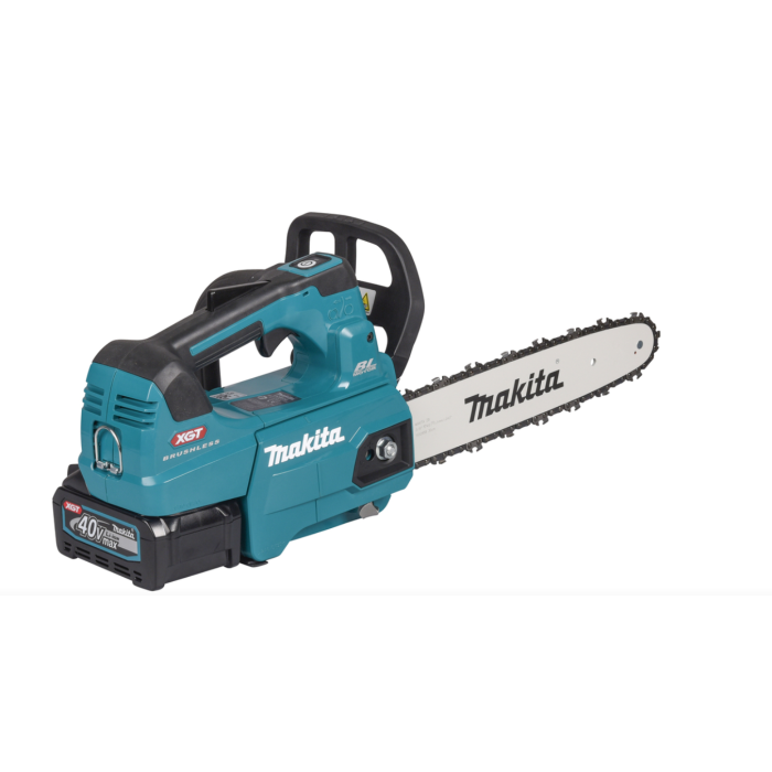 Akumulatorowa pilarka łańcuchowa zasilana akumulatorem 40 V Max XGT, wyposażona w prowadnicę o długości 30 cm, o osiągach zbliżonych do pilarki spalinowej z silnikiem o pojemności 30 cm3. Akum. pilarka łańcuchowa UC003G została wyposazona w technologię WetGuard/IPX4, zapewniającą wysoką odporność na wodę która pozwala na pracę nawet gdy urządzenie jest mokre. Z okienkiem pozwalającym sprawdzić poziom oleju do smarowania łańcucha w zbiorniku. Urządzenie posiada regulowany automatyczny system smarowania łańcucha; włącznik spustowy z regulacją obrotów; lampkę ostrzegająca przed niskim poziomem naładowania akumulatorów; obwód chroniący przed przegrzaniem oraz nadmiernym rozładowaniem akumulatorów; wymianę i naciąg łańcucha przy pomocy narzędzia; główny wyłącznik zasilania z funkcją automatycznego wyłączania; funkcję anti-kickback oraz hamulec elektryczny; metalową ostrogę zębatą oraz nakrętki zamontowane w obudowie, które zapobiegają ich wypadnięciu i zgubieniu podczas wymiany łańcucha lub prowadnicy. Hak umożliwia przypięcie urządzenia do paska podczas pracy na wysokościach.